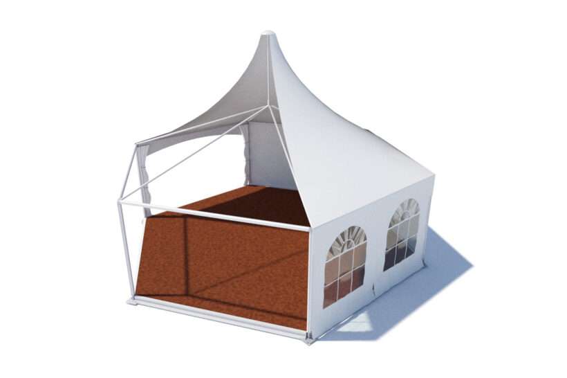 Das Pluto, Mars und Jupiter wirden standardmäßig mit Schiebeplanen geliefert, mit Fenstern auf einer Seite. Das Schiebeplane hat eine ansprechende weiße Farbe. Das Pagodenzelt ist ausgestattet mit dem Kassettenboden von Neptunus. Das Dach ist in einer opaken (lichtundurchlässigen) Version.