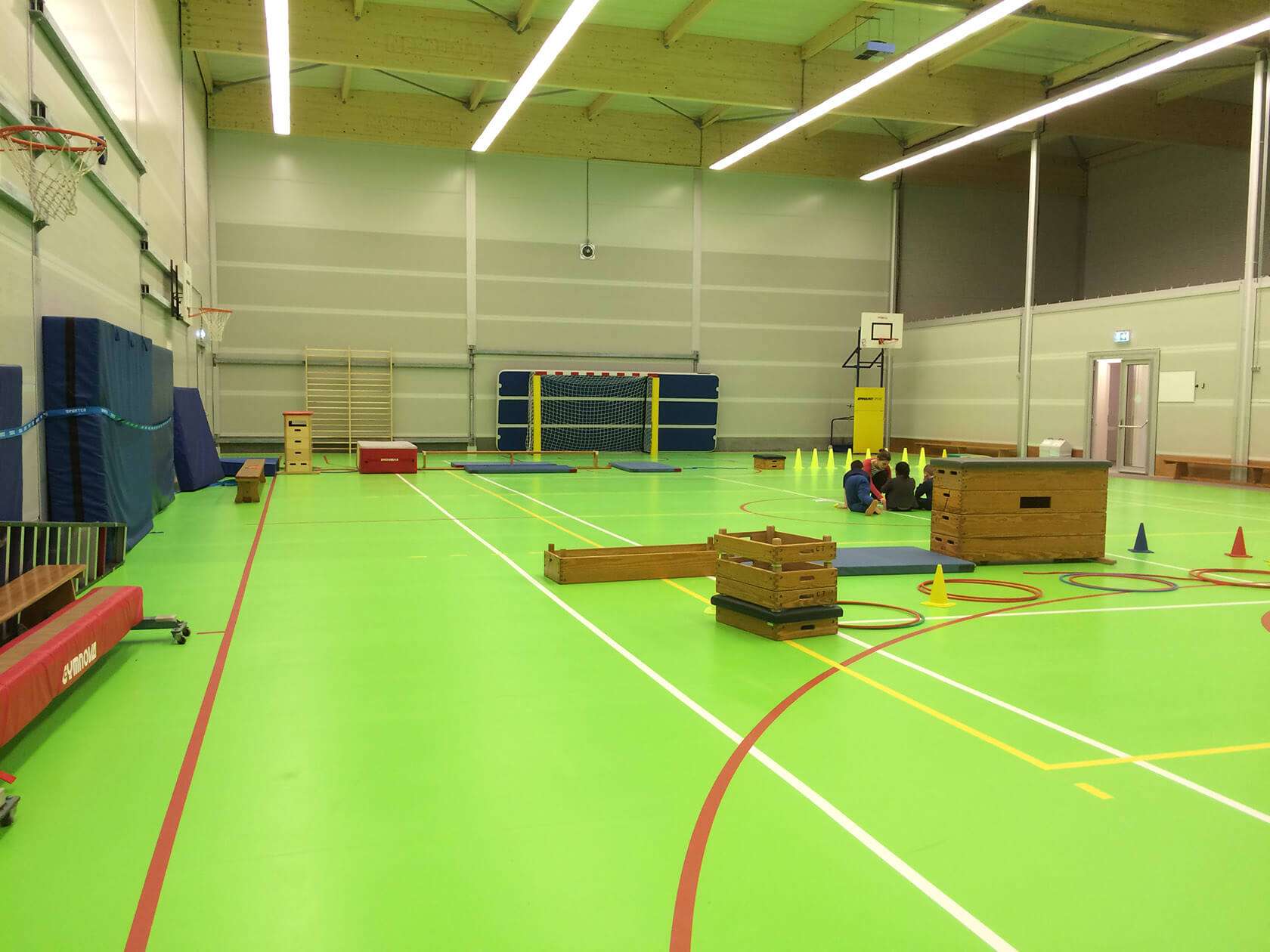 Die Sporthalle (720 m2) verfügt über ein 18 m x 30 m (540 m2) großes Spielfeld. Auf 180 m2 befinden sich separate Toiletten und Duschräume für Männer und Frauen, eine barrierefreie Toilette, Lagerräume, das Büro des Hausmeisters, ein Raum für die Haustechnik und ein Behandlungs-/Umkleideraum für Betreuer und Lehrer. Ein mit der Halle verbundenes Flexolution II Gebäude (72 m2) bietet zusätzlichen Lagerraum. Die Sporthalle hat ein Erscheinungsbild wie ein permanentes Gebäude, deshalb müssen die Benutzer nicht auf Komfort verzichten.